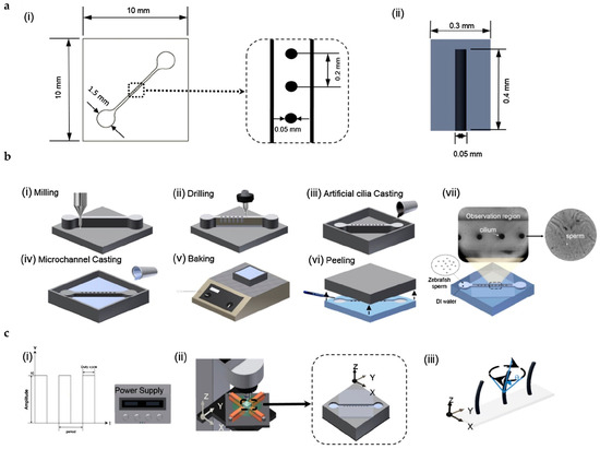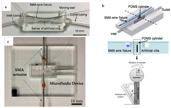 (a) Top view of the photographed microchannel with an array of artificial cilia and SMA fixture. (b) The top two figures explain the relative position of the PDMS cylinder on the artificial cilia, and the bottom figure explains the mechanism of the cylinder’s rotation corresponding the artificial cilia tilting angle. (c) SMA-based actuators in the microfluidic device as explained in ref. [77] for immobilization of the zebrafish within the observation chamber. (a,b) are reproduced from ref. [76] with permission from Springer Nature under CC BY license, and (c) is reproduced from ref. [77] with permission from MDPI under CC BY license.