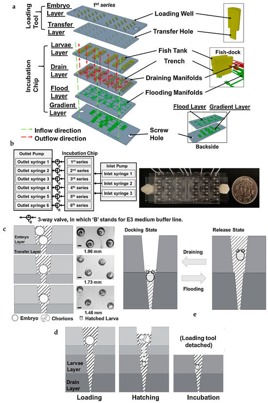 Fish-doc microarchitecture (a) Six detachable layers of the system composing two detachable components: the loading tool and the incubation chip with inlets and outlets (flow directions depicted by green and red arrows). (b) Schematic and image of the system with three-way valves. Each outlet syringe is interfaced with a three-way valve before connecting to a functional series. Buffer lines are connected to open reservoirs filled with E3 medium. The microdevice assembly with a loading tool and incubation chip is fastened together by a pair of plastic screws. (c) Optimization of the chamber dimensions for housing one embryo per chamber ensuring the larvae can pass through the transfer layer but the embryos cannot. (d) The loading tool is removed right after hatching of the larvae to successfully remove the chorion. (e) The docking method to fix the larvae in desired orientation for imaging. Draining the liquid from the larvae layer fixes the larvae in the drain layer because of the geometry as shown. Reproduced from ref. [53] with permission from Elsevier.
