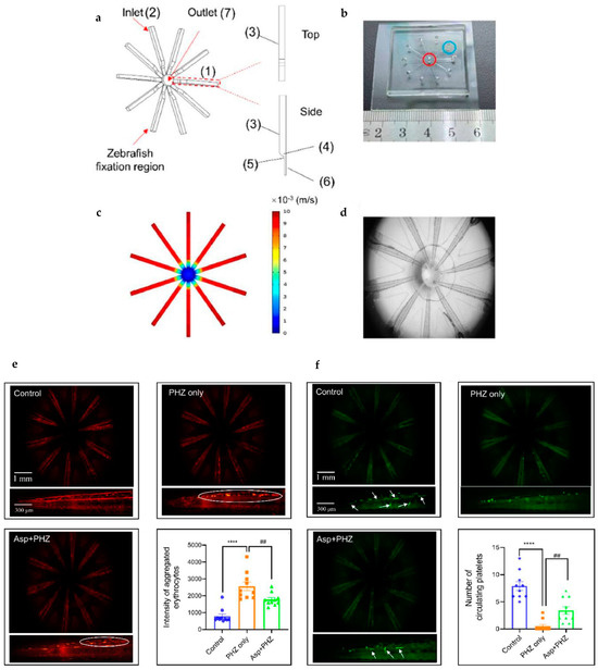 Structure of the zebrafish LIZMC. (a) Composition of the LIZMC: (1) individual monomer; (2) inlet; (3) main channel; (4) head fixed chamber; (5) height gradient area; (6) tail fixed chamber; (7) outlet. (b) An image of the LIZMC. Red circle: outlet; Blue circle: inlet. (c) Simulation results of the flow dynamics within a chip after larvae loading. (d) An image of ten zebrafish larvae fixed in the LIZMC. (e) Intensity of aggregated erythrocytes/red blood cells for different combination of PHZ and Asp. (f) Number of circulating platelets for different combination of PHZ and Asp. ## p < 0.01. **** p < 0.0001. Reproduced from ref. [54] with permission from Elsevier.