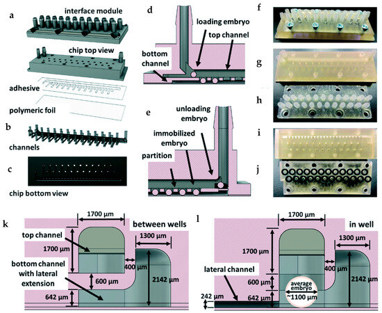 A milli fluidic chip for the cultivation of Danio rerio embryos. (a) An expanded view of the cultivation chip components. From the top, an interface module for the connection of the system for a single embryo removal, the chip body (from a top-side view), the adhesive, and transparent polymeric foil; (b) the channels of the chips; (c) a bottom view of the chip; (d,e) a side cut view of the front and the rear parts of the chip, respectively. (f–j) Three-dimensional printed parts of the cultivation chip: (f) the chip with an interface module, (g) the chip alone, (h) the interface module alone, (i) a bottom view of the chip, and (j) a bottom view of the interface module, including O-rings. (k,l) Front cut views between and in the center of a cultivation well. Reproduced from ref. [55] with permission from RSC Publishing.