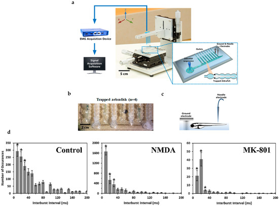 Cho et al. [56] introduced a high-throughput method for measuring muscular activity in zebrafish larvae using an innovative microfluidic chip-based trapping system. The microfluidic chip featured a single inlet, eight outlets, and eight trapping channels with a wavy shaped section to facilitate effective trapping (Figure 13a,b). Zebrafish larvae were introduced into the microfluidic channels one by one using a water stream controlled by a syringe. Once all the larvae were trapped, water flow was halted to stabilize their positions and eliminate external noise, ensuring precise electrophysiological recordings. The system incorporated M1 stainless steel screws as ground electrodes (Figure 13c), which were positioned in punctured holes to maintain contact with the zebrafish heads. Tungsten needle electrodes were employed for intramuscular recordings. A customized micromanipulation system enabled the precise insertion of needle electrodes into the axial myomeres of the trapped larvae under direct visual guidance, aided by magnifying lenses. The ground and needle electrodes were then connected to a signal acquisition system for electromyography (EMG) recordings. Muscular activity was recorded under four different experimental conditions: one with untreated larvae and three with larvae preincubated in different chemicals (Tricaine, NMDA, and MK-801) that modulate muscle activity. No muscle activities were detected there for the tricaine group. Figure 13d shows the average number of muscle activities that were detected and the interburst intervals of the remaining three groups. It is evident that the chemical treatments resulted in distinct EMG signal patterns (specifically under the 40 ms of interburst interval), demonstrating the system’s capability for studying drug effects on muscular function. Although EMG recordings were conducted on only four larvae at a time due to the limitations of the data acquisition system (DAQ), the scalability of the system allows for recordings from more larvae by increasing the number of channels and using higher-resolution DAQs. This novel method offers a robust platform for high-throughput studies of muscular activity in zebrafish, with potential applications in drug screening and neurophysiological research.