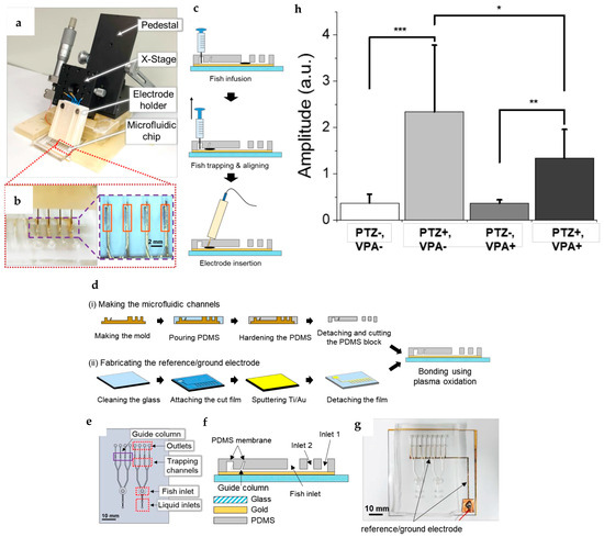 - Lee, Y.; Seo, H.W.; Lee, K.J.; Jang, J.-W.; Kim, S. A Microfluidic System for Stable and Continuous EEG Monitoring from Multiple Larval Zebrafish. Sensors 2020, 20, 5903. [Google Scholar] [CrossRef]