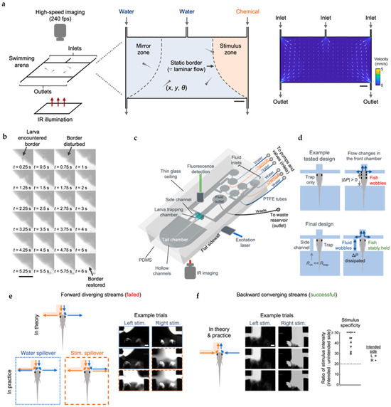 (a) Schematics of the chemosensory behavioral assay (fluidics-based swimming arena) and simulated fluid velocity profile (right) (b) Time-lapsed images (contrast-enhanced) showing transient border disturbance and restoration in an example larval zebrafish border-crossing event. (c) Schematics of the PDMS microfluidic (microfluidic) module with a larval chamber, a tail chamber, and a fluid delivery front chamber, which was made compatible with whole-brain and tail imaging. (d) Side channel to dissipate the pressure change due to the flow change in front chamber. (e) Forward diverging stream causing spillover. (f) Backward converging stream strategy to prevent the spillover. Reproduced from ref. [46] with permission from Springer Nature under the CC BY license.