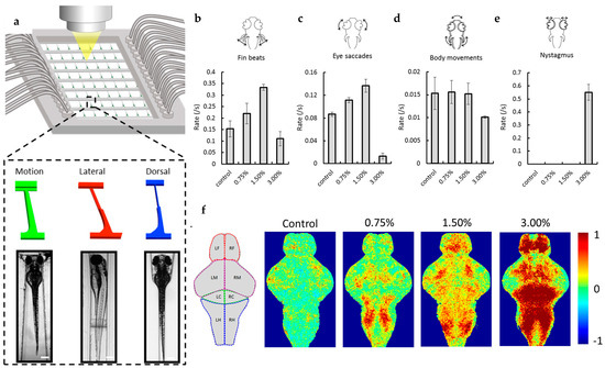 Lin et al. [80] developed an autonomous microfluidic system using a series of chips to study ethanol-induced acute responses in larval zebrafish across multiple organs. This system enabled high-throughput, gel-free, and anesthetic-free manipulation, allowing real-time observation of behavioral and physiological changes at the cellular resolution, overcoming the limitations of traditional immobilization methods [111,112]. The system comprised three types of chips—motion, lateral, and dorsal—each utilizing hydrodynamic force to load and immobilize larvae, with the primary difference being the shape of the trapping channels to facilitate the observation of behavior, cardiac function, or brain activity (Figure 16a). The motion chip was used to analyze pectoral fin beats, eye saccades, and body movements in 7 dpf larvae exposed to ethanol concentrations ranging from 0.00% to 3.00% v/v. At low ethanol levels (0–1.5%), pectoral fin beats increased from 0.15 ± 0.03 to 0.33 ± 0.01 beats/s, but dropped significantly to 0.11 ± 0.03 beats/s at 3.00% (Figure 16b). A similar pattern was observed for eye saccades, which increased at lower concentrations but decreased significantly at 3% (Figure 16c). Although body movements did not increase initially, they were substantially reduced at the highest ethanol concentration (Figure 16d), and a distinct locomotion pattern, eye nystagmus, emerged (Figure 16e). The lateral chip, used with fluorescence microscopy, revealed that heart rate slowed in a dose-dependent manner across ethanol concentrations of 0.00%, 0.75%, 1.50%, and 3.00% v/v. Meanwhile, the dorsal chip combined with calcium imaging showed that ethanol induced dose-dependent stimulation of brain activity, starting in the caudal hindbrain at 0.75% and spreading to the cerebellum, ventral midbrain, and forebrain at higher concentrations (Figure 16f). Exposure to 3.0% ethanol significantly slowed most behavioral activities and heart rate, while the forebrain showed the most intense neuronal excitation at this level.
