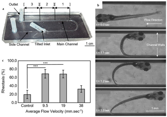 (a) The microfluidic device used to study the rheotaxis of zebrafish larvae, consisting of a tilted inlet tube for loading the larva, a U-shaped expanding channel for retaining the larva in the device, and a main channel for rheotaxis studies. (b) Bright field images of rheotactic orientation of a 7 dpf zebrafish larva upon stimulation by a water flow velocity of 19 mm·s−1 in Section 1 of the device. The flow direction is from right to the left of the pictures (tail-to-head). It is observed that the larva tends to display rheotaxis by swimming against the flow within 1.3 s. (c) Rheotaxis (%) at different flow velocity. ***: two-tailed t-test, p-value < 0.001. Reproduced from ref. [48] with permission from Springer Nature.
