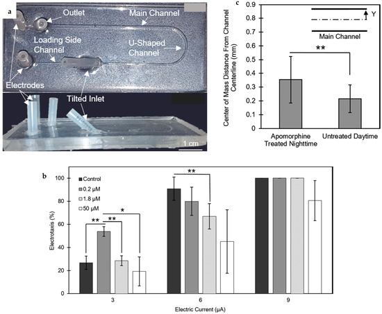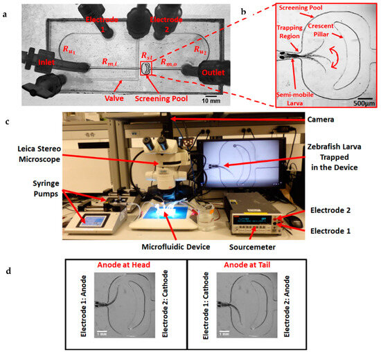 - Peimani, A.R.; Zoidl, G.; Rezai, P. A microfluidic device to study electrotaxis and dopaminergic system of zebrafish larvae. Biomicrofluidics 2018, 12, 014113. [Google Scholar] [CrossRef]