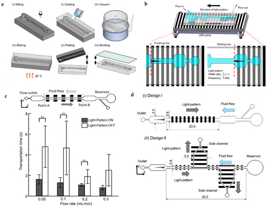 Fabrication and experimental system. (a) (I–VI) Fabrication of the microfluidic device consisting of two microwells and one experimental chamber. (b) Experimental setup consisting of a microfluidic, flow control, and optical illumination setup platform. The optical setup illuminated the larvae from the bottom with an optimum grating frequency of 1.0 Hz and a grating width ratio of 1:1. A syringe pump was connected at the outlet to draw fluid, while the fluid was introduced manually at the inlet. The schematics are not to scale. (c) The average transportation time of zebrafish larvae corresponding with the increase in flow rate with the presence and absence of visual cues. Transportation time can be defined as the swimming time taken by the juvenile zebrafish larvae from starting point A to destination point B. (d) Design and dimensional details of both of the microfluidic devices used for the experiments. All dimensions are in mm. ** p-value < 0.01; paired sample t-test. Reproduced from ref. [81] with permission from MDPI under the CC BY license.