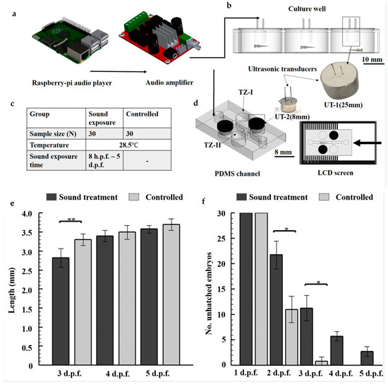Study of the impact of noise exposure on laboratory-grown zebrafish. (a) Audio system setup for acoustic control. (b) Culture dish with transducers. (c) Larvae culturing matrix. (d) Microfluidic setup for transportation and trapping of larvae using light and acoustic stimuli. (e) Growth rate of larvae (exposed and unexposed to sound). (f) Hatching rate of larvae (exposed and unexposed to sound). * p-value < 0.05, ** p-value < 0.001 for the independent sample t-tests. Reproduced from ref. [83] with permission from AIP Publishing.