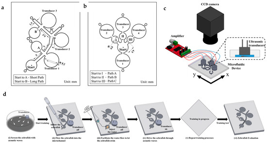 Using sound stimuli, Loganathan et al. [84] proposed a novel microfluidic device to investigate spatial memory in zebrafish, which is the ability to recall the location of objects and places as well as the relationships between them. The device was fabricated using a combination of computerized numerical control micromachining techniques and PDMS casting processes. It allowed for the analysis of various motion parameters, including curvilinear speed (VCL, mm/s), straight-line speed (VSL, mm/s), and motion linearity (LIN = VSL/VCL), under the influence of acoustic stimuli produced by an ultrasonic transducer linked to a high-resolution digital class D audio amplifier. Figure 22a illustrates the geometric design of the device, incorporating short and long paths to facilitate spatial learning in zebrafish larvae. Sound stimuli generated by the transducers were used to guide the larvae through these paths to help them acquire spatial information. Figure 22b details the geometric design of the microfluidic chip used to test the consistency of the startle response (C-bend) triggered by the experimental setup, while Figure 22c presents a schematic of the entire system. Figure 22d outlines the different stages of the sequential learning and testing processes for the zebrafish larvae. To evaluate the level of learning in the larvae, a metric called latency was used to measure the response time between stimuli. Additionally, a memory extinction parameter known as freezing was utilized to assess the loss of conditioned aversion in the larvae, quantifying the extent of retained memory over time. The study examined the responses of 4–6 days post-fertilization (dpf) larvae to sound frequencies of 200, 600, and 1200 Hz with different waveforms. The highest curvilinear velocity (VCL) and straight-line velocity (VSL) were recorded at 1200 Hz with sawtooth waves, measuring 19.98 ± 14.51 mm/s and 8.94 ± 5.14 mm/s, respectively. Memory retention was evaluated using latency and freezing parameters, with 6 dpf larvae showing 42.5 ± 4.8% freezing in the short path and 19.3 ± 3.7% in the long path at the end of a 30-min test. The findings suggest that zebrafish larvae can develop and maintain spatial memory, with higher sound frequencies enhancing both startle responses and memory retention.