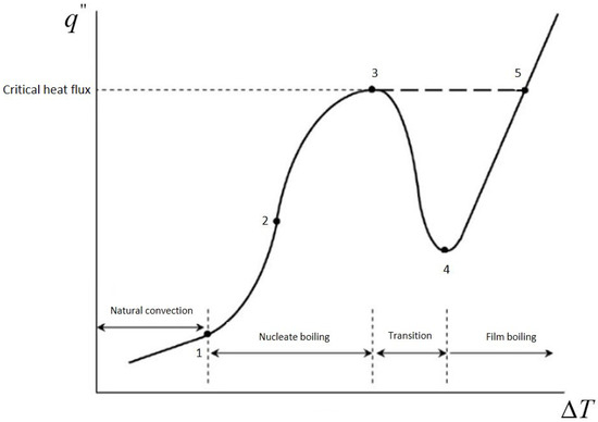 Schematic representation of the boiling curve: 1—onset of nucleate boiling, 2—fully developed nucleate boiling, 3—critical heat flux, 4—transition, 5—film boiling.