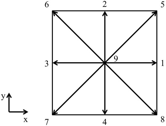 The two-dimensional numerical simulations utilize the D2Q9 velocity model. Figure 2 depicts a diagram of this scheme.