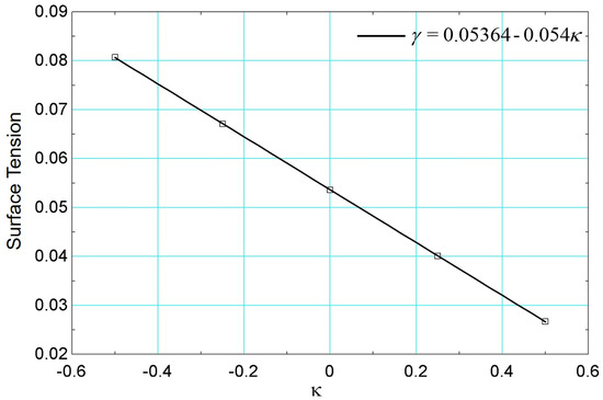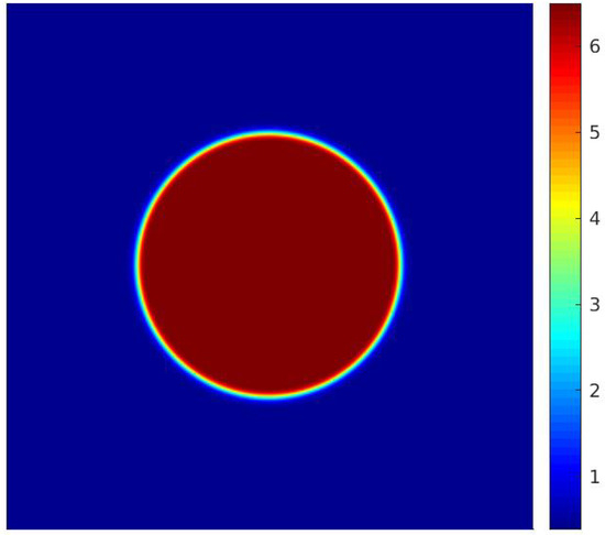 With reference to the parameters of Equation (59), represents the initial droplet radius, denotes the center coordinates of the computational domain, and indicates the thickness of the interface as per [15]. The simulation convergence criterion is established by assessing the relative error in the density field in successive iterations, with a residual value set to . Once the density field has converged, the surface tension is calculated using the Young–Laplace equation: