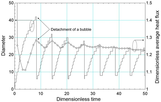 In this section, the bubble cycle simulations use the parameters described in the study by [20]. The simulations were conducted for a reduced temperature of . For the Peng–Robinson equation, the parameters are set as , , and . This allows us to determine the critical temperature, which is . The equilibrium density values are and . Thermophysical properties include , , and . It is important to note that both phases were assigned the same value for thermal diffusivity. The thermal conductivity for each phase is determined by , as outlined in [20]. Furthermore, the authors assumed . The acentric factor corresponds to that of water, namely . Lastly, the thermodynamic consistency adjustment parameter is set to .