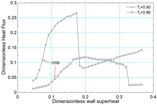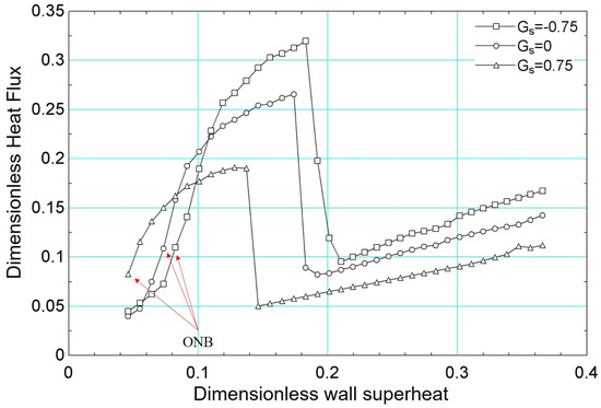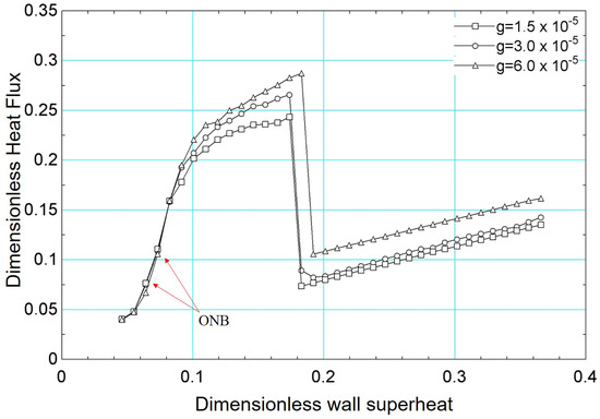 The results in Figure 24 demonstrate that the influence of gravitational acceleration is more evident from . From this value, the effect of bubble detachment is more intense, increasing the heat flux. The critical flux is also influenced by gravitational acceleration. As shown in the figure, the critical flux is higher for and occurs for a higher superheat value. From a qualitative point of view, the numerical results presented in Figure 24 are in agreement with experimental results in the literature [61,62].