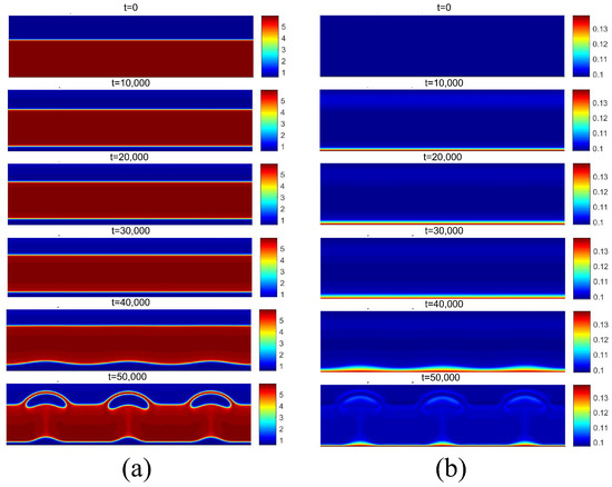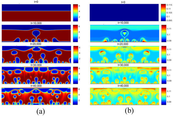 In this work, a different strategy is used, based on the work of [50,51]. In this case, once the initial density and velocity fields are known, the equilibrium distribution function is calculated and used in the initialization. Subsequently, only the hydrodynamic model is solved, without the effect of gravitational acceleration, until the density and velocity fields reach convergence, considering a relative residual of . After the fields converge, the effect of gravitational acceleration is considered and the energy conservation equation is solved.