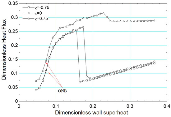 Results of dimensionless heat flux versus dimensionless surface superheating for for different values of the parameter : −0.75, 0 and 0.75.