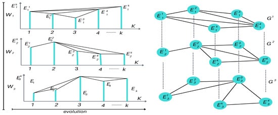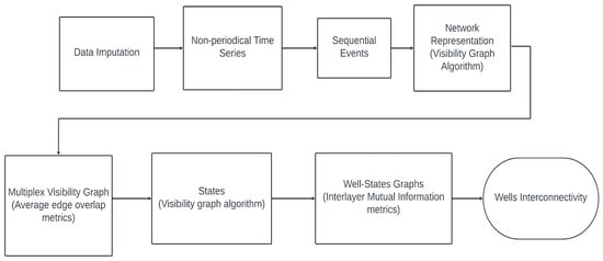 During the productive lifespan of an oil field, well interactions evolve, resulting in multiple sequences of events. These were effectively represented as a multivariate network using a multiplex visibility graph (MVG), as illustrated in Figure 3. The MVG retained the essential characteristics of the simpler VG method, such as its ability to capture long-term dependencies and topological features [14]. Multivariate event sequences could be expressed as , with the corresponding graph set represented as .