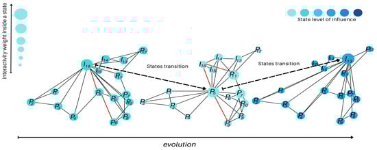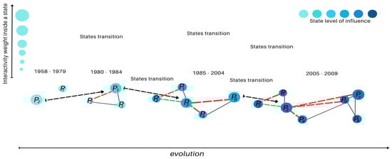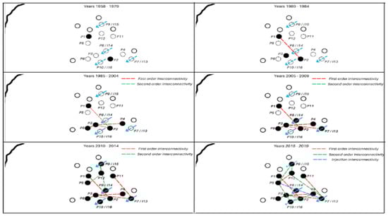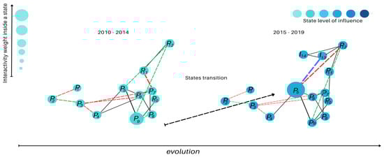 From 2015 to 2019, the addition of injection wells and introduced new dynamics. exhibited strong connectivity with and , while emerging second-order connections between and became evident (Figure A7). The global evolution for the years 2010 to 2019, together with the state transitions, can be appreciated in Figure 10.