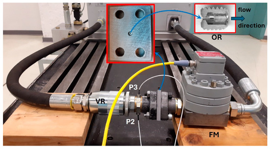 The experimental tests were conducted at the Fluid Power Research Laboratory of the Politecnico di Torino. The hydraulic scheme of the test rig is shown in Figure 1. The flow rate was generated by the main hydraulic power unit of the laboratory, where an axial piston pump equipped with an absolute pressure limiter with setting p* controlled remotely allows the test rig to be fed at constant pressure. A photo of the test rig with a zoomed view of the mounting of one of the orifices under study is reported in Figure 2. The inlet pressure is measured by a pressure transducer (P1) Keller PAA-21Y with range 0 ÷ 400 bar and overall accuracy (including linearity, hysteresis, repeatability, and temperature coefficients) ±1% FS. The flow rate was measured by a gear flow meter (FM), VSE 1 GPO12V, with an accuracy of 0.3% of the measured value and a range of 0.05 ÷ 80 L/min. Under the operating conditions of flow rate and viscosity considered in this study, the pressure drop introduced by the meter in the worst case is approximately 0.1 bar, which is absolutely negligible.
