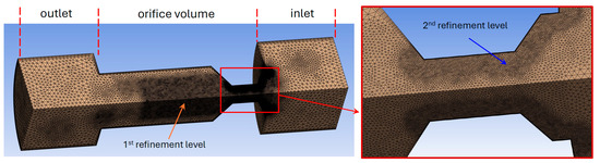 The ANSYS meshing tool was used to generate the tetrahedral mesh. For each geometry, mesh refinement was applied to the minimum flow area as well as in the fluid domain downstream from it, in order to accurately capture high velocity and pressure gradients. More specifically, the first refinement level was obtained with a cylindrical body of influence with a diameter of 2 mm overlapped to the internal volume, while the second level of refinement was applied on the surfaces of the hole and the upstream chamfer. Five inflation layers were generated on the walls.