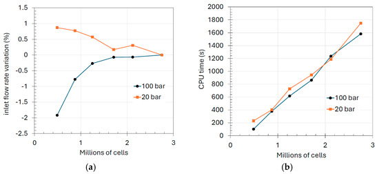 The mesh independence analysis was carried out on the orifice with a diameter of 1 mm. The size of the cells used in the entire volume, within the cylindrical body of influence (1st level of refinement) and on the surface of the hole (2nd level of refinement) is listed in Table 2. Additionally, for the latter, the distance from the surface where the finest refinement is applied is also provided. The inlet pressure was set to 200 bar and the outlet pressure to 100 bar and 20 bar. In the case with 100 bar, no cavitation occurs, whereas in the case with 20 bar, the flow becomes choked. In Figure 6a, the variation in the flow rate with respect to the case with the maximum number of cells is shown, while in Figure 6b, the effect on the computational time is reported. Mesh-independent results are achieved starting from approximately 1.5 million cells. The simulations were performed on a 10-core Intel i9-10900X processor at 3.7 GHz.
