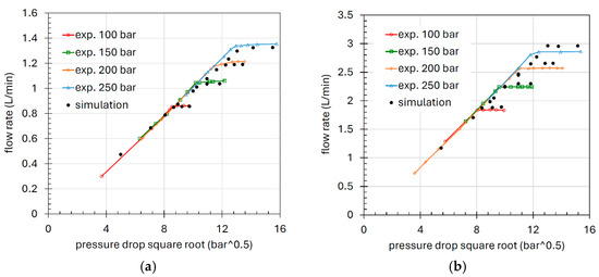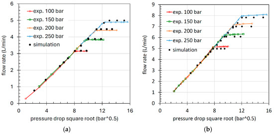 The model validation was performed for all four orifice diameters, with four different supply pressures: 250, 200, 150 and 100 bar. The test was conducted by varying the downstream pressure using the manual restrictor VR. The results are shown in Figure 7 and Figure 8, expressed in terms of flow rate as a function of the square root of the pressure drop, in agreement with previous studies [29,30]. In this way, the correlation results in a straight line, with the slope depending on the passage area, discharge coefficient, and fluid density, in accordance with Equation (1). The saturation condition occurs when the flow rate becomes constant.