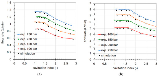 Flow-pressure drop characteristics in non-cavitating conditions comparing experimental data and simulation results: (a) 0.6 mm diameter; (b) 1 mm diameter.
