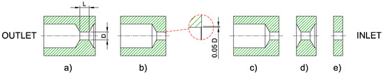Orifice with a diameter of 1 mm and L/D = 1, featuring various inlet and outlet geometries: (a) original, (b) with small inlet chamfer, (c) with sharp edge, (d) without hex socket, (e) ideal.