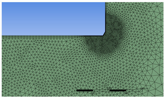Once the model is validated on different hole sizes and supply pressures, the simulation methodology is used to study the influence of some geometric parameters. The first aspect considered is the geometry of the inlet and outlet. It is known from the literature [3,22] that if the edge is not sharp, the discharge and cavitation coefficients can be significantly different. However, the goal is to obtain the values for this specific geometry, which is characterized by a chamfer generated by the drill tip and the recessed hexagon for the wrench. To understand the effect of the individual elements, the geometries shown in Figure 11 have been simulated. Geometry (a) is the reference used for validation. Geometry (b) differs in that an upstream chamfer with a 60-degree angle and a width equal to 5% of the hole diameter is present. In this specific case, it is on the order of a few hundredths of a millimeter. With reference to this geometry, a further refinement of the mesh was performed at the chamfer with cells of 5 μm in size, as shown in Figure 12. Geometry (c), on the other hand, has a sharp edge at the inlet. Geometry (d) is obtained from the original one, with the difference that there is no recessed hexagon downstream, allowing the flow to expand freely. Finally, geometry (e) is obtained from (d) by removing the chamfers at the upstream and downstream, thus resulting in an ideal diaphragm with sharp edges.