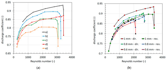 Discharge coefficient vs. Reynolds number with inlet pressure of 200 bar: (a) 1 mm orifice with different inlet and outlet geometries; (b) direct and reverse flow for the orifices with geometry (a) and diameters of 1 mm, 0.8 mm and 0.6 mm.
