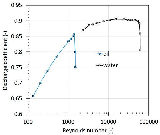 Another very interesting aspect is that, especially for smaller diameters, cavitation occurs at very low Reynolds numbers, even below 3000–4000, which is conventionally considered the threshold above which the flow becomes fully turbulent. Furthermore, it should also be considered that for lower inlet pressures, the Reynolds number corresponding to the onset of cavitation decreases even further. It therefore appears evident that, in the case of hydraulic oil and under the operating conditions of these calibrated orifices, the classical treatment found in most of the literature, where the discharge coefficient asymptotically approaches a constant value for high Reynolds numbers (>104), does not accurately reflect the real operating conditions. Figure 16 shows the discharge coefficient for the 0.6 mm orifice as a function of the Reynolds number using both water and oil as fluids. As observed, cavitation with water occurs in the region where the coefficient is constant, meaning in a fully turbulent regime, whereas with oil, it happens already in the transition zone.