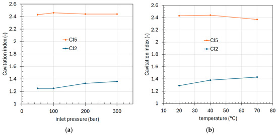 (a) Critical cavitation indexes for orifice No. 6: (a) as a function of the inlet pressure; (b) as a function of oil temperature with inlet pressure of 200 bar.