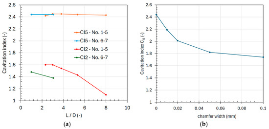 (a) Critical cavitation indexes for all 7 orifices as a function of the length-to-diameter ratio with inlet pressure of 200 bar; (b) critical cavitation index CI5 for orifice No. 6 with different values of the chamfer at the inlet and inlet pressure of 200 bar.