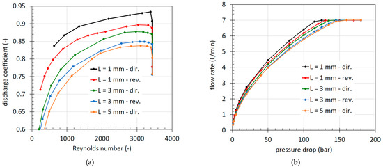 Characteristics of the 1 mm orifice of Figure 3 and inlet pressure of 200 bar with three different lengths (1 mm, 3 mm and 5 mm): (a) discharge coefficient vs. Reynolds number; (b) flow rate vs. pressure drop.