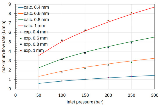 In Figure 20, the comparison is shown between the flow rate under choked flow conditions measured for all four orifices and calculated using Equation (9). This limiting flow rate is valid for both direct and reverse flow and does not depend on the L/D ratio, at least within the analyzed range from 1 to 8.
