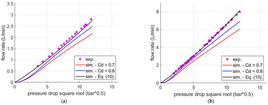 To demonstrate the accuracy achievable in calculating the flow rate using Equation (10) and the practical implementation in a commercial software package, simulations were conducted in Simcenter Amesim® Rev 2304. The specific restrictor submodel available in the software, which requires as an input a lookup table that expresses the discharge coefficient as a function of the Reynolds number, was used. This submodel automatically handles the numerical issues of the integrator that would arise when the pressure differential approaches zero [31]. Figure 22 reports the flow-pressure drop characteristics for two orifice diameters (0.6 mm and 1 mm), showing both experimental results and simulated data using the lumped parameter model.