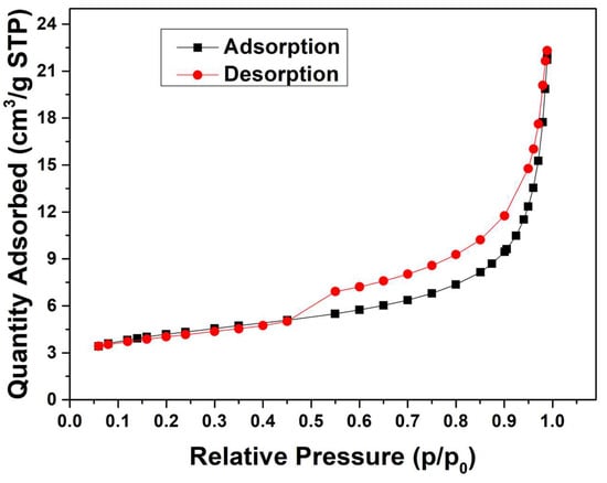 The charcoal samples were characterized for their total pore volume, average pore size, specific surface area, and pore size distribution. The average pore diameter was 113.21 Å, indicating that the material is mesoporous, type III, according to the IUPAC classification [27]. This result suggests that the SSC produced in this work is adequate for BaP adsorption due to the presence of mesopores. The obtained values for the total pore volume and for the specific surface area were 0.021 cm3 g−1 and 17.68 m2 g−1, respectively. Similar findings were reported by Zielińska et al. [28], who produced charcoal from sewage sludge for pyrene adsorption. The researchers showed that pyrene, a molecule similar in size to BaP, filled the mesopores, and found a similar value for the specific surface area (18.13 m2 g−1). Most studies that use charcoal produced from biomass obtain a higher surface area [29,30]. However, these results are a consequence of the chemical activation of the material, which is commonly applied to increase the surface area. Figure 2 presents the adsorption and desorption isotherms for sewage sludge coal. These isotherms are type IVa with hysteresis loop type H3, indicating that the material is mesoporous and corroborating previous findings [31].