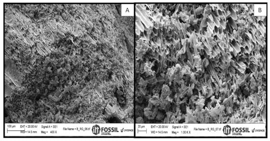Figure 3 shows the SEM images of SSC at 400× (Figure 3A) and 1000× (Figure 3B). The surface morphology appears heterogenous with pores of varying sizes. It is possible to identify some well-defined pores and others with fibrous and rough structures, as well as the presence of ash, tar and other non-volatile compounds. It is important to mention that cylindrical structures with longitudinal pores are a favorable characteristic for the adsorption of BaP in the coal. These structures are a consequence of the precursor material decomposition as no chemical treatment was performed to activate the charcoal in the present study [32].
