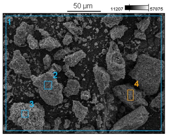 SEM images of sewage sludge coal. The points 1, 2, 3, and 4 were selected to evaluate the chemical composition of the material by EDS analysis.