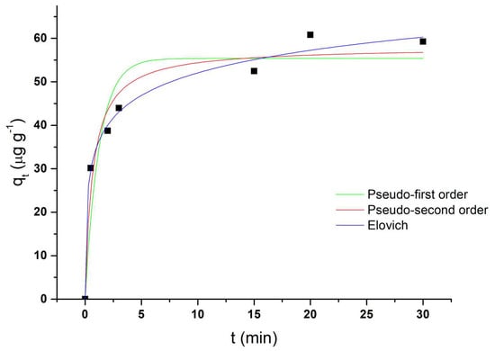 The kinetic experiments for the adsorption of BaP were carried out using a dosage of 1.0 g L−1 of SSC, within an initial total concentration of the BaP of 100 µg L−1. The stirring rate was set to 150 rpm using an orbital shaker, and the temperature was maintained at 25 ± 1 °C. Samples were collected and promptly filtered through filter paper at different times (0, 2, 4, 6, 8, 10, 15, 20, 25, and 30 min). Subsequently, the quantification of BaP was performed following the procedure outlined in Section 2.7. After chromatographic determination, the adsorption capacity at any time (qt, mg g−1) was calculated using the pseudo-first-order (PFO), pseudo-second-order (PSO), and Elovich models, expressed by Equations (1), (2), and (3), respectively.