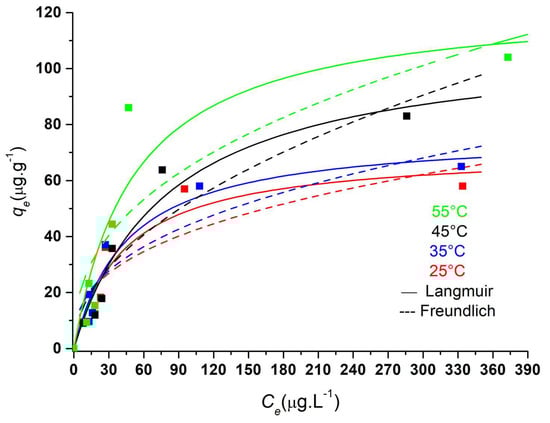 where Ce is the equilibrium concentration (μg L−1). The Langmuir and Freundlich isotherm models were used to establish the correlation of the equilibrium curves, according to Equations (12), and (13), respectively.