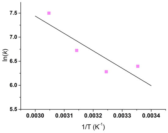 The thermodynamic adsorption characteristics of BaP by SSC were assessed by calculating the enthalpy, entropy, and Gibbs free energy changes, and the results are presented in Table 4. The enthalpy change in the process was calculated by Arrhenius equation using the KD values derived from the Langmuir parameters with the adjusted data presented in Figure 7. The negative ΔG values indicated that the BaP adsorption by SSC was a spontaneous and favorable process. The values ranging from −15.84 to −20.44 indicated that the spontaneity increased with the increase in temperature. The positive ΔH value show that the adsorption process was endothermic, and the positive ΔS value indicated that the disorder in the solid–liquid interface increased during the adsorption process.
