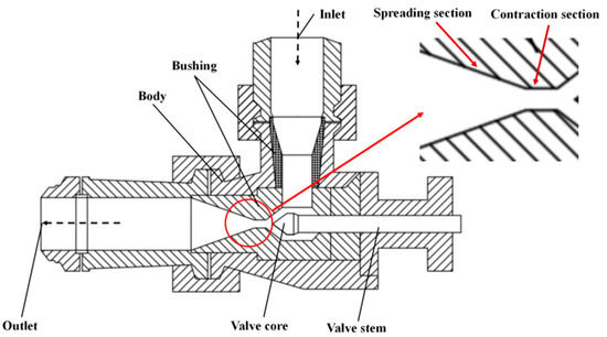 Figure 2 shows the structural diagram of the regulating valve. The valve is a conical angle valve, and mainly includes a valve stem, a seat, a bushing, a valve core, a valve body, and other components. The valve stem is used to connect the spool, and the opening can be adjusted by moving the valve stem. The seat and the spool are engaged components that can cut off the flow when the regulator is completely closed. The bushing is used to protect the valve from damage; however, in actual applications, the spool and the lower part of the bushing are often damaged due to the bias of the flow and the throttling part of the seat and the spool [23,24]. WC is the raw material used in the production of the valve seat and bushing, and 316L stainless steel is the raw material of the spool and stem. WC and an adhesive containing Co are coated on the spool surface via high-speed oxygen fuel. The thickness of the WC-Co coating is 500 μm and its chemical composition is shown in Table 2.