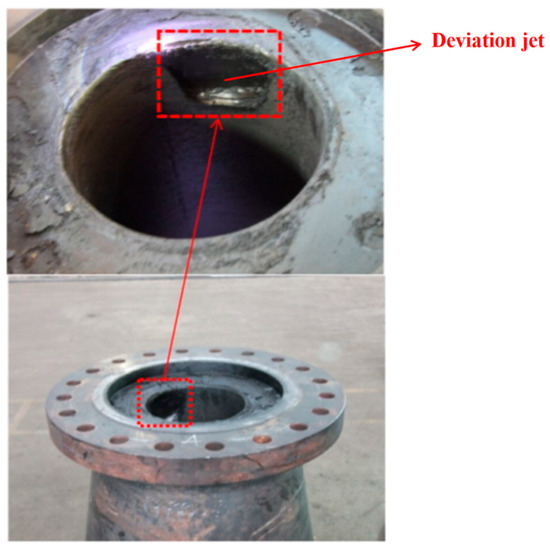 Figure 4 shows the damage morphology of the downstream bushing of the valve. It shows that the bushing exhibits clear erosion and wear marks only on one side. It was initially speculated that the structure of the control valve causes a 90° change in the flow channel. As a result, one side of the bushing is seriously damaged.