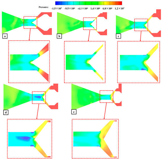 Pressure distribution cloud maps under different spool structures ((a) 72°, (b) 90°, (c) 98°, (d) 105°, (e) 120°).