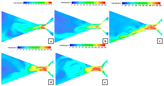 Velocity distribution in the meridian plane of the angle valve with different spool shapes ((a) 72°, (b) 90°, (c) 98°, (d) 105°, (e) 120°).