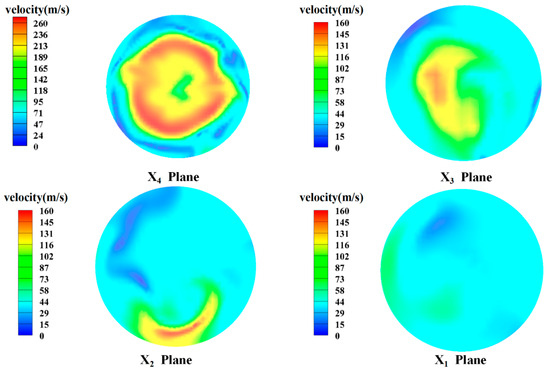 Figure 14 shows the velocity field cloud images of the four sections (x1–x4) inside the valve when the spool angle is increased to 105°. At this time, the flow characteristics of sections x3 and x4 in the downstream contraction section of the valve core are similar to those when the cone angle of the valve core is 98°. In section x4, the high-speed flowing fluid is mainly concentrated in the central area, while in section x3, the high-speed-flow area is dispersed near the upper and lower walls, which indicates that the drift phenomenon at the back end of the downstream contraction section of the valve is more severe. The high-speed fluid is concentrated near the wall of the contraction section. The impact of the high-speed fluid on the wall’s surface is relatively strong. When the fluid flows through the downstream expansion section of the valve (cross-sections x1–x2), there is a significant bias phenomenon at the left wall of the valve expansion section. At this time, the area with a higher fluid velocity is mainly concentrated at the left wall of the valve expansion section. From the comprehensive analysis of the four cross-sections, we can see that under the conditions of this spool structure, the high-speed fluid is mainly concentrated at the wall of the valve, which can easily cause erosion wear failure in the valve.