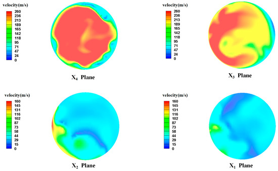 Figure 13 shows the velocity field cloud images of the four sections (x1–x4) inside the valve when the spool angle is further increased to 98°. In the downstream contraction section of the valve core (sections x3–x4), the low-flow-rate area is reduced; in section x4, the fluid at the center of the valve moves at a high speed. When flowing through section x3, the high-speed-flow area is mainly concentrated at the left wall of the valve contraction section, and at this time, the eccentric jet is also more severe. The velocity near the wall is greater than 200 m/s. This means that the impact on the wall of the valve core is more severe at this time. In sections x1–x2 of the expansion section of the valve, the low-speed area in the valve increases and the flow rate of the valve decreases. However, near the left wall of section x2, the flow rate is still higher than that of other structures. This shows that under these conditions, the eccentric jet of the valve is more severe, which is not conducive to the continuous operation of the valve.