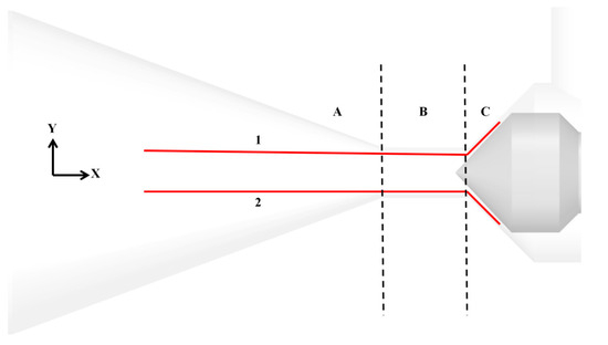 Distribution diagram of pressure monitoring lines (1, 2 are the positions of the two monitoring lines respectively, and A, B, and C are three different pressure monitoring areas).
