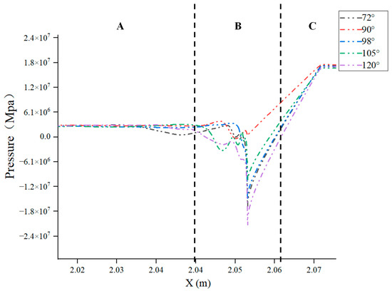 Figure 17 and Figure 18 show the pressure distribution at the upper and lower monitoring lines of the valve under different spool structures. When the working fluid enters the retracted part of the valve seat, the speed increases and the pressure decreases due to a reduction in the flow area. When approaching the top position of the downstream of the spool, the pressure drops to the lowest value and the velocity reaches its maximum. When the fluid flows through the downstream contraction section of the spool and the rear end diffusion section, the flow area increases, the pressure gradually increases, and then the area is stabilized. From the comparative analysis of the pressure fluctuations in Figure 17 and Figure 18, it can be seen that when the spool angle is 98°, 105°, and 120°, the pressure fluctuation at monitoring line no. 2 is more severe than that at monitoring line no. 1, indicating that there is an intense eccentric jet phenomenon near the lower side wall of the valve.